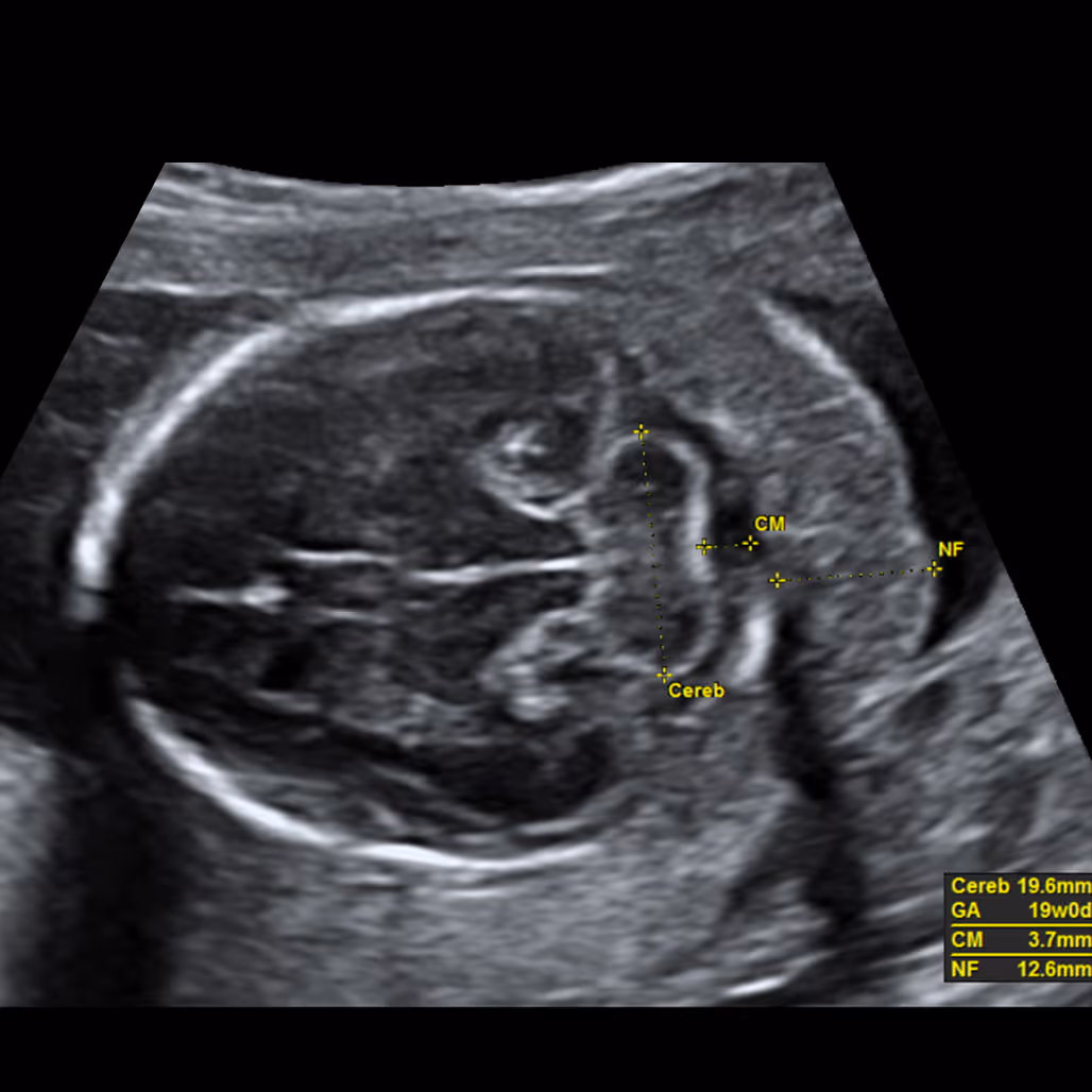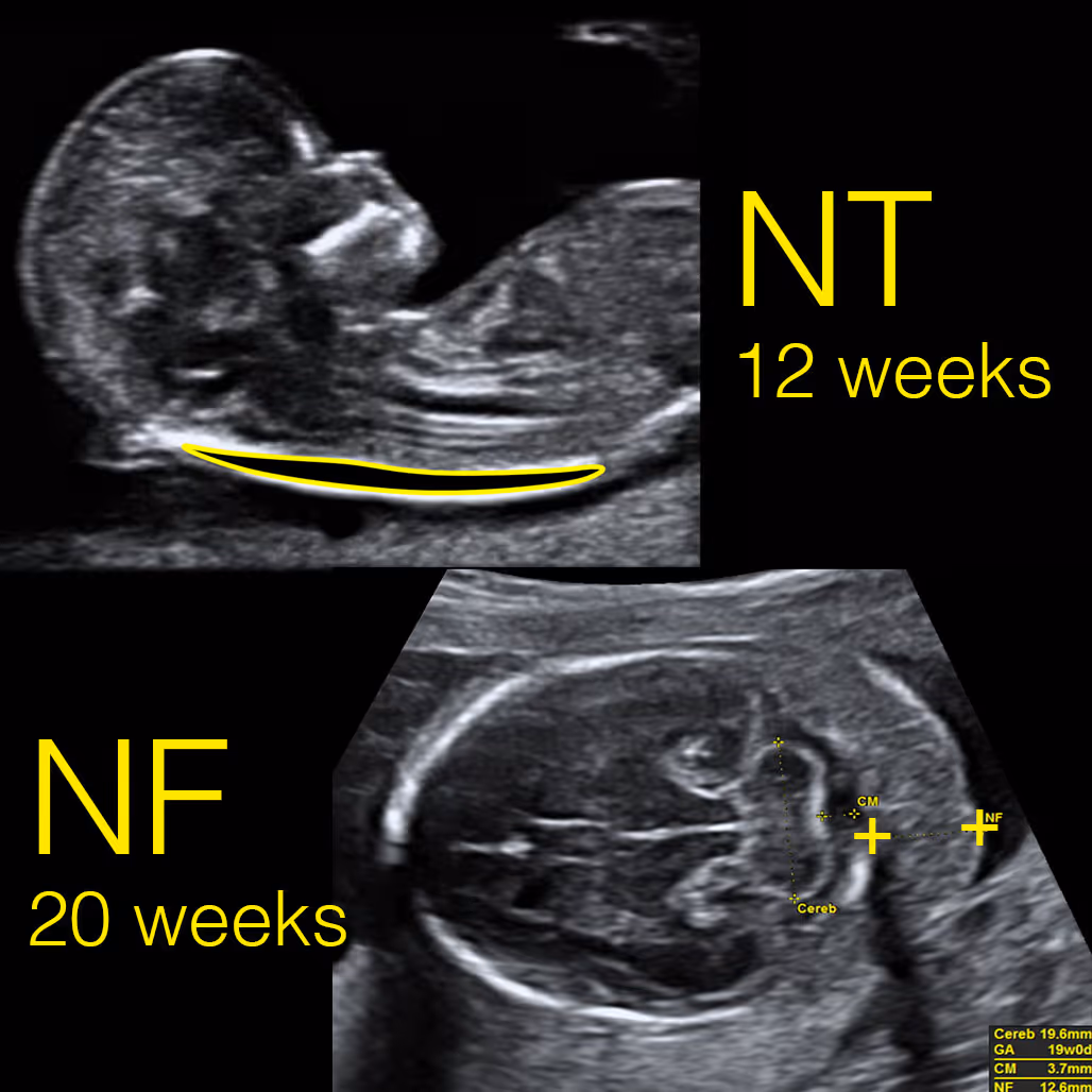 Both NT and NF look at the area at the back of the baby’s neck, but at different stages of pregnancy. NT (nuchal translucency) is a small pocket of fluid seen on the 11–14 week scan. It usually disappears after 14 weeks. NF (nuchal fold) is measured later, around 15–20 weeks, and looks at the soft tissue thickness instead of fluid. A thick NF can sometimes be a sign of certain chromosome conditions such as Down syndrome.